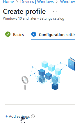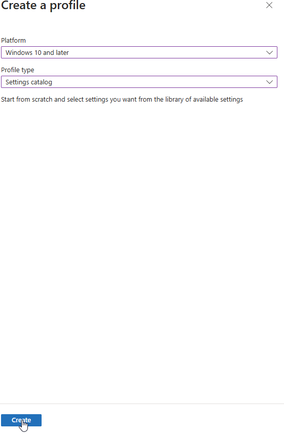 In “Profile type” select “Settings catalog” and click “CREATE”